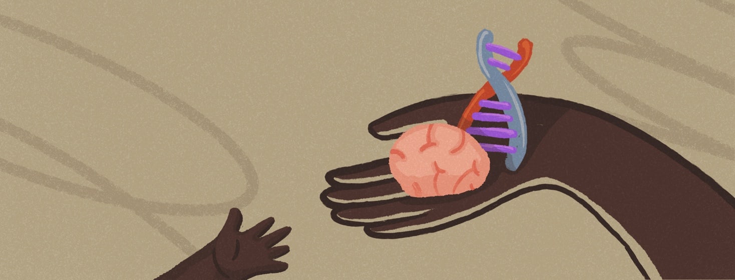 Adult hand holding a genetic strand and a small brain giving them to a smaller toddler/child hand